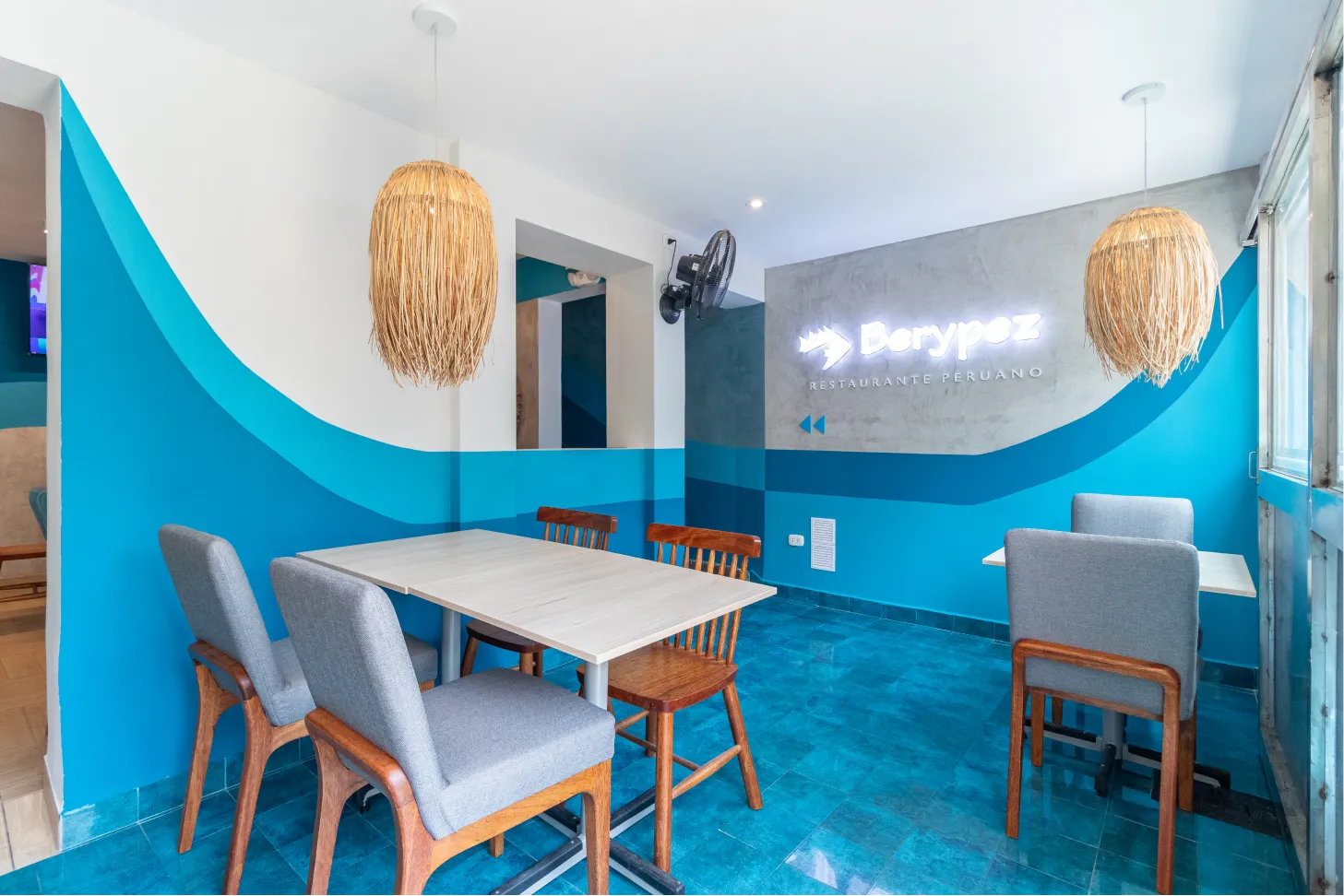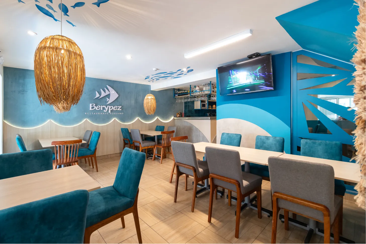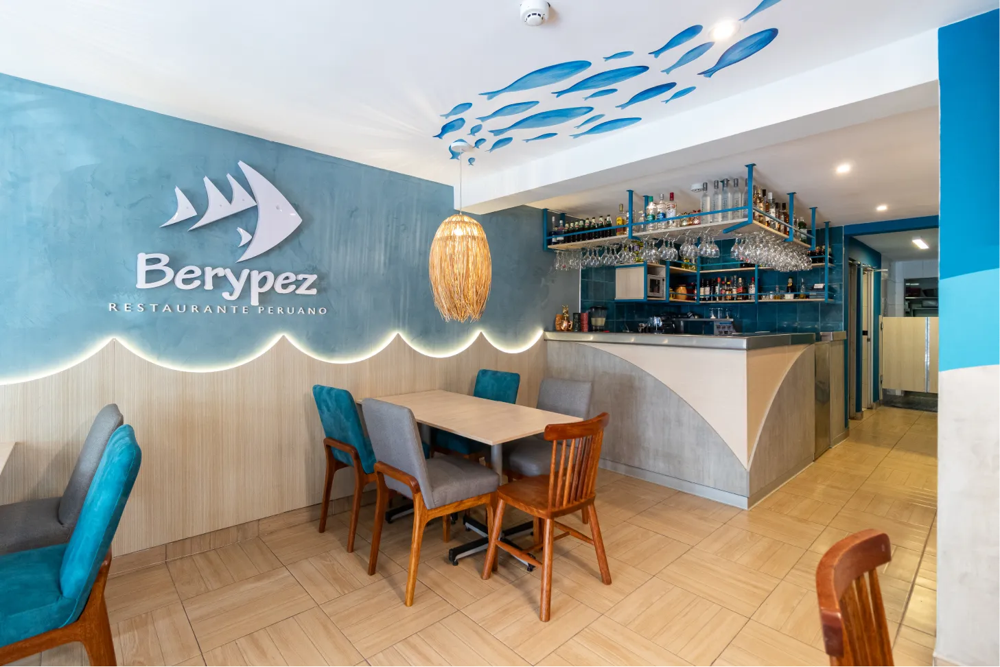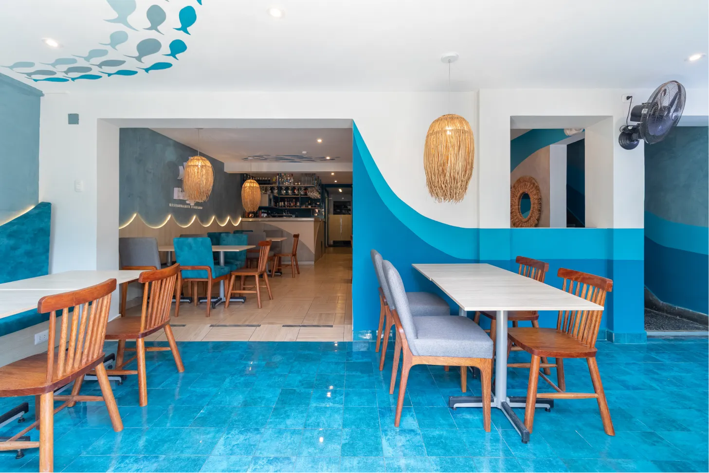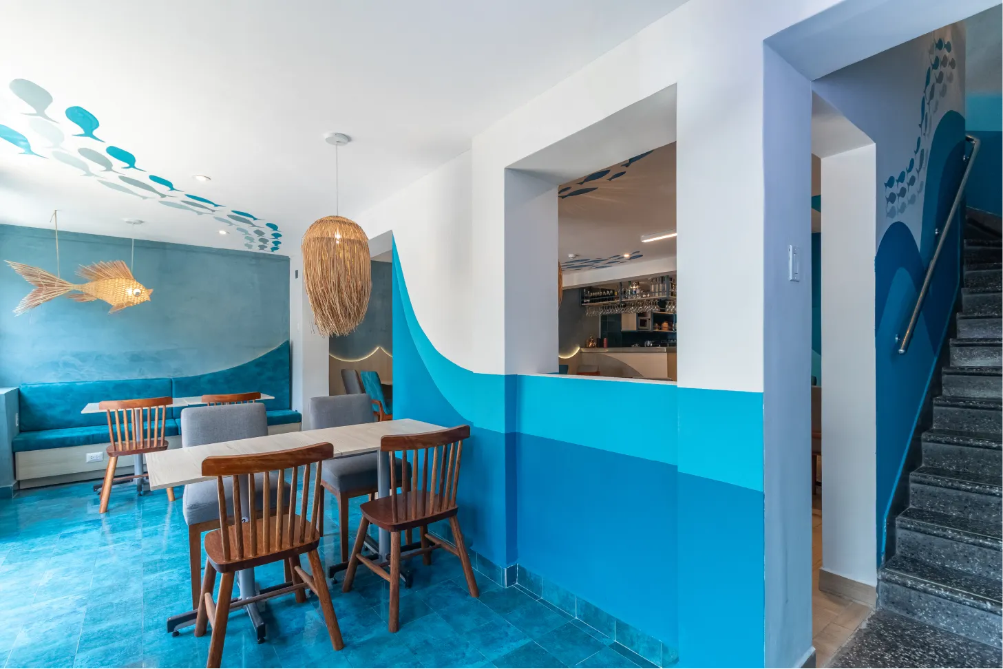 Transformamos este local gastronómico en un ecosistema marino dónde los tonos azules se fusionan con los tonos amaderados creando calidez y diversión al espacio.