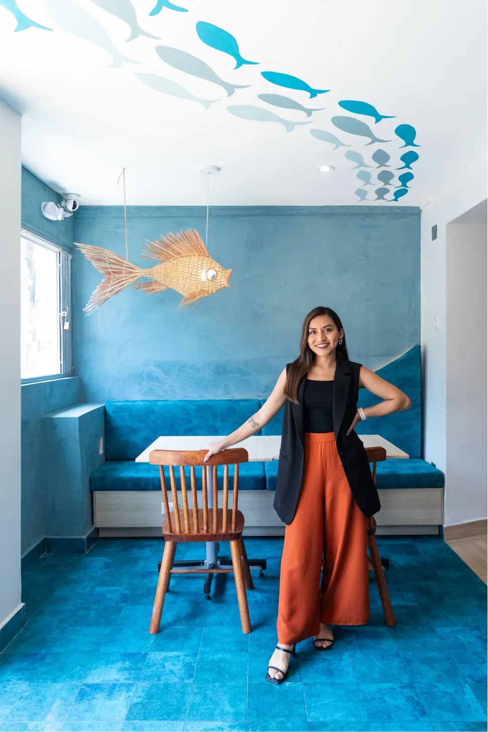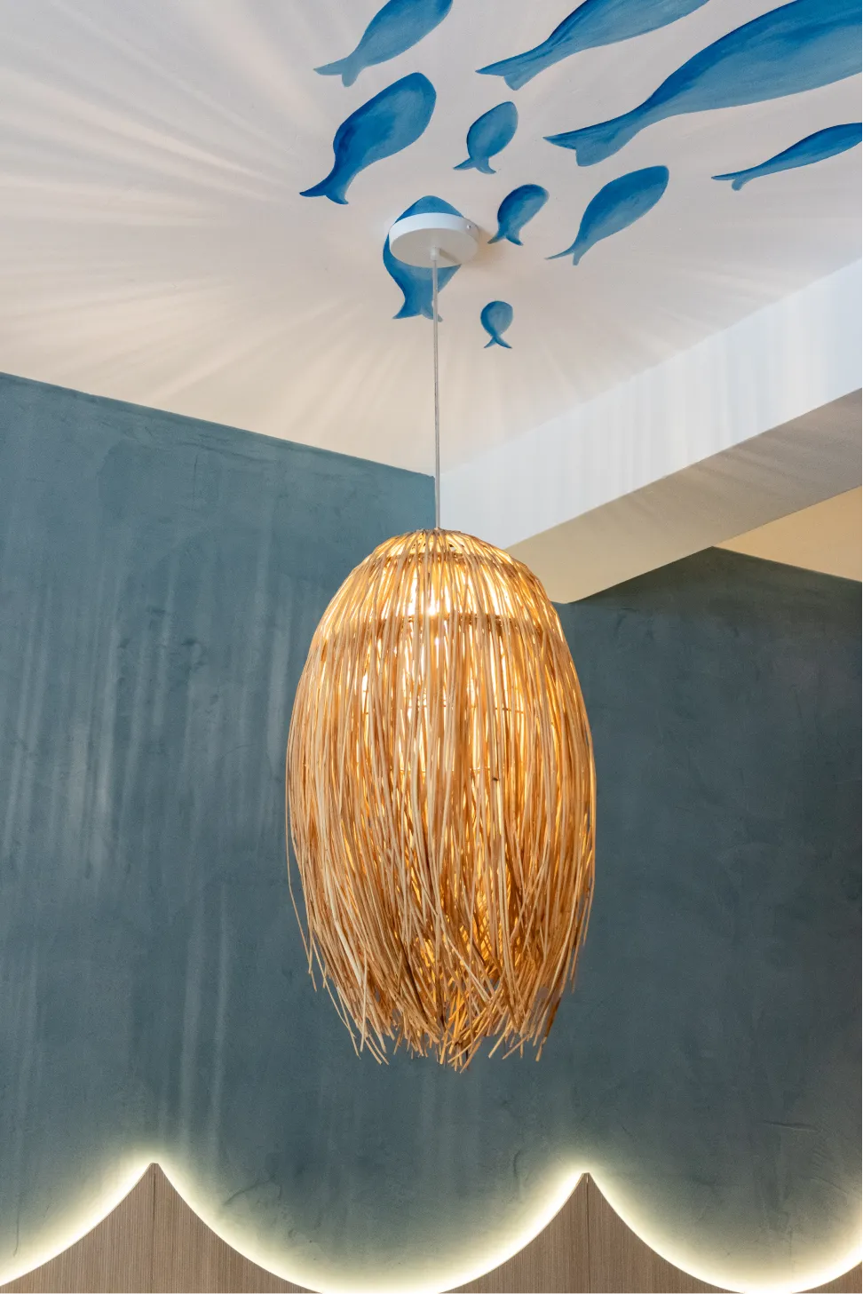 Se intervino el techo pintado a mano por la misma arquitecta creando recorridos visuales con siluetas de peces en degrades de colores.